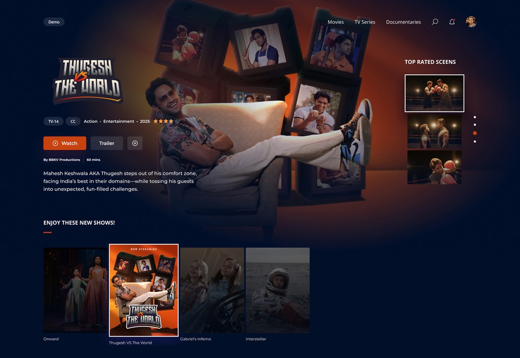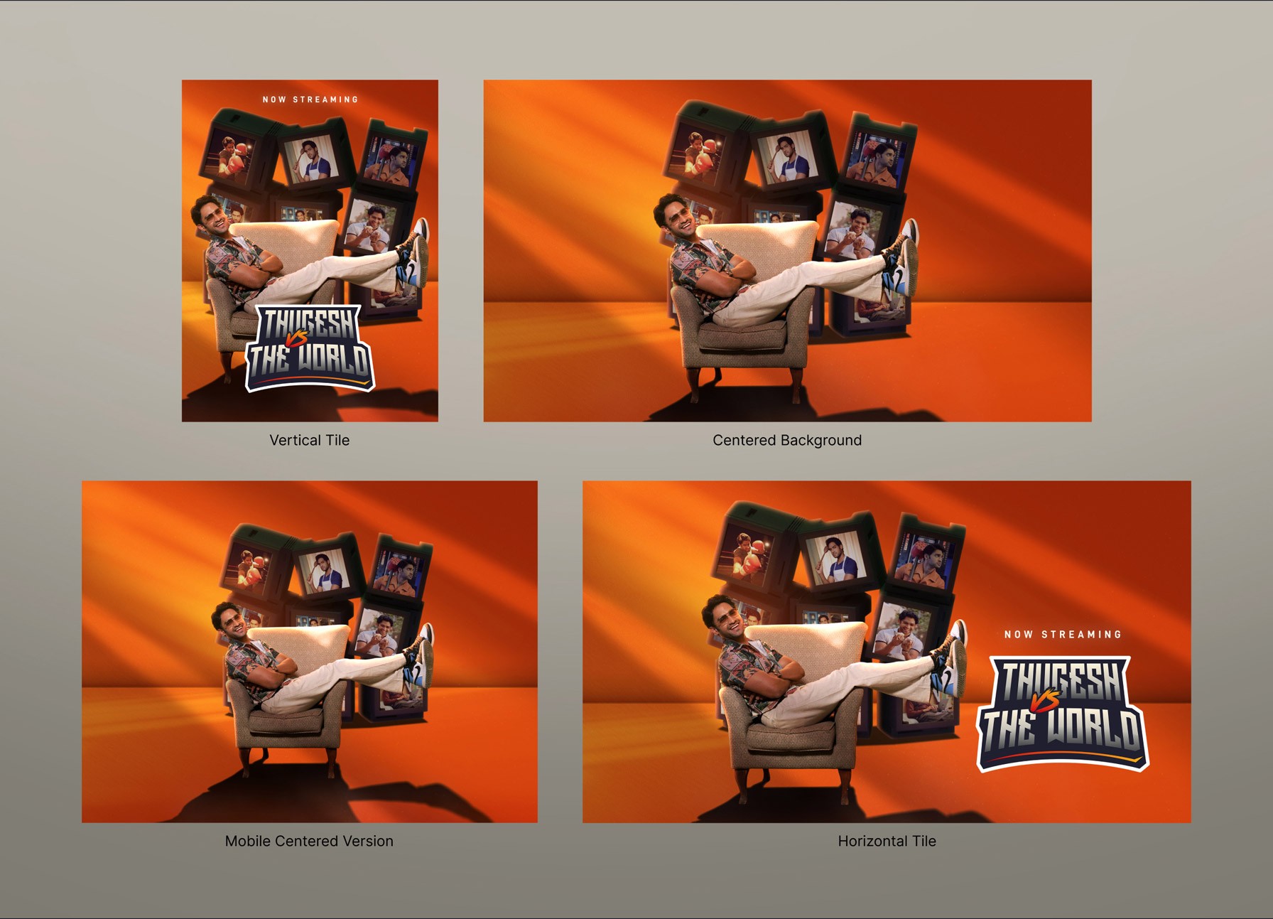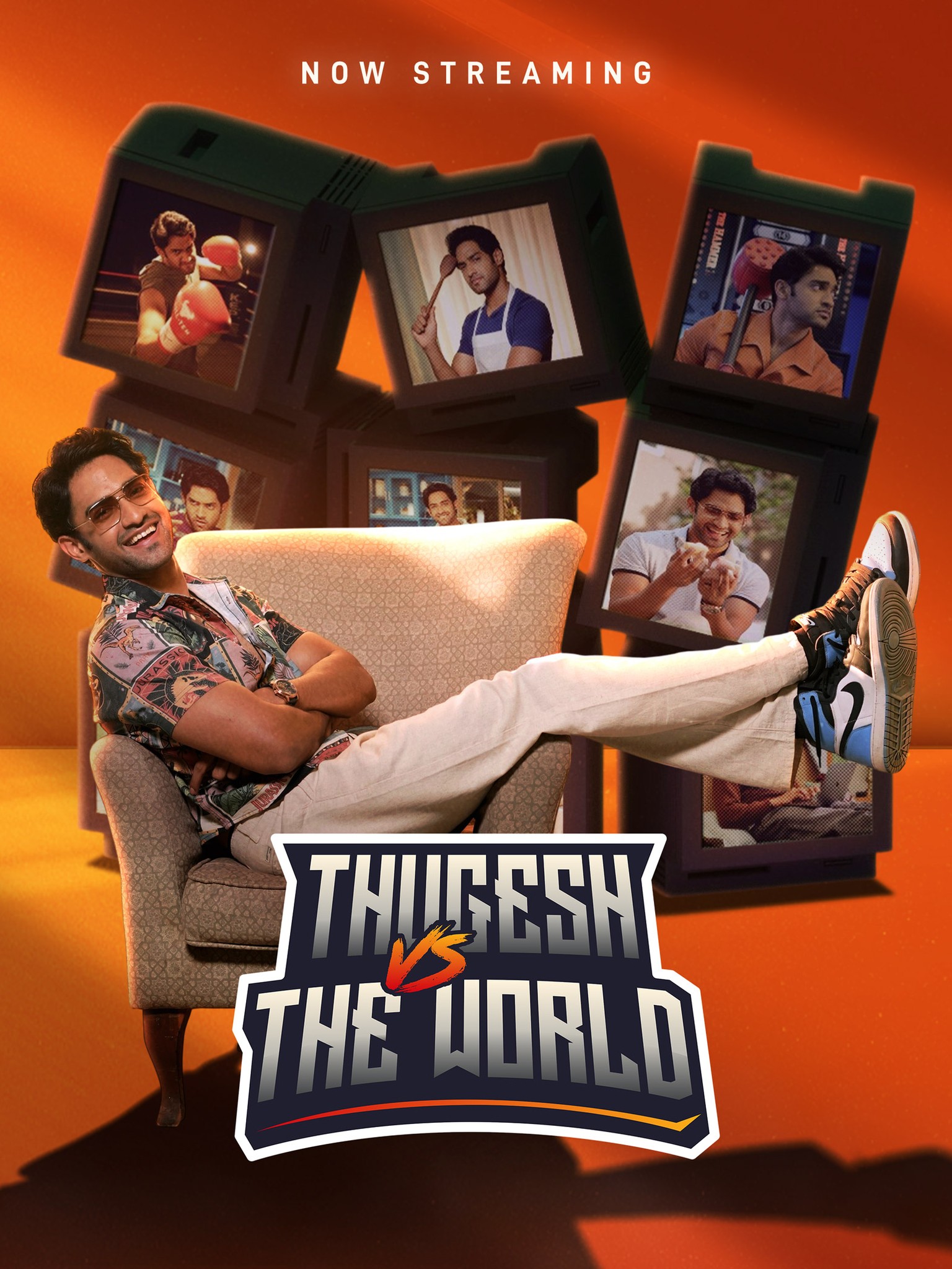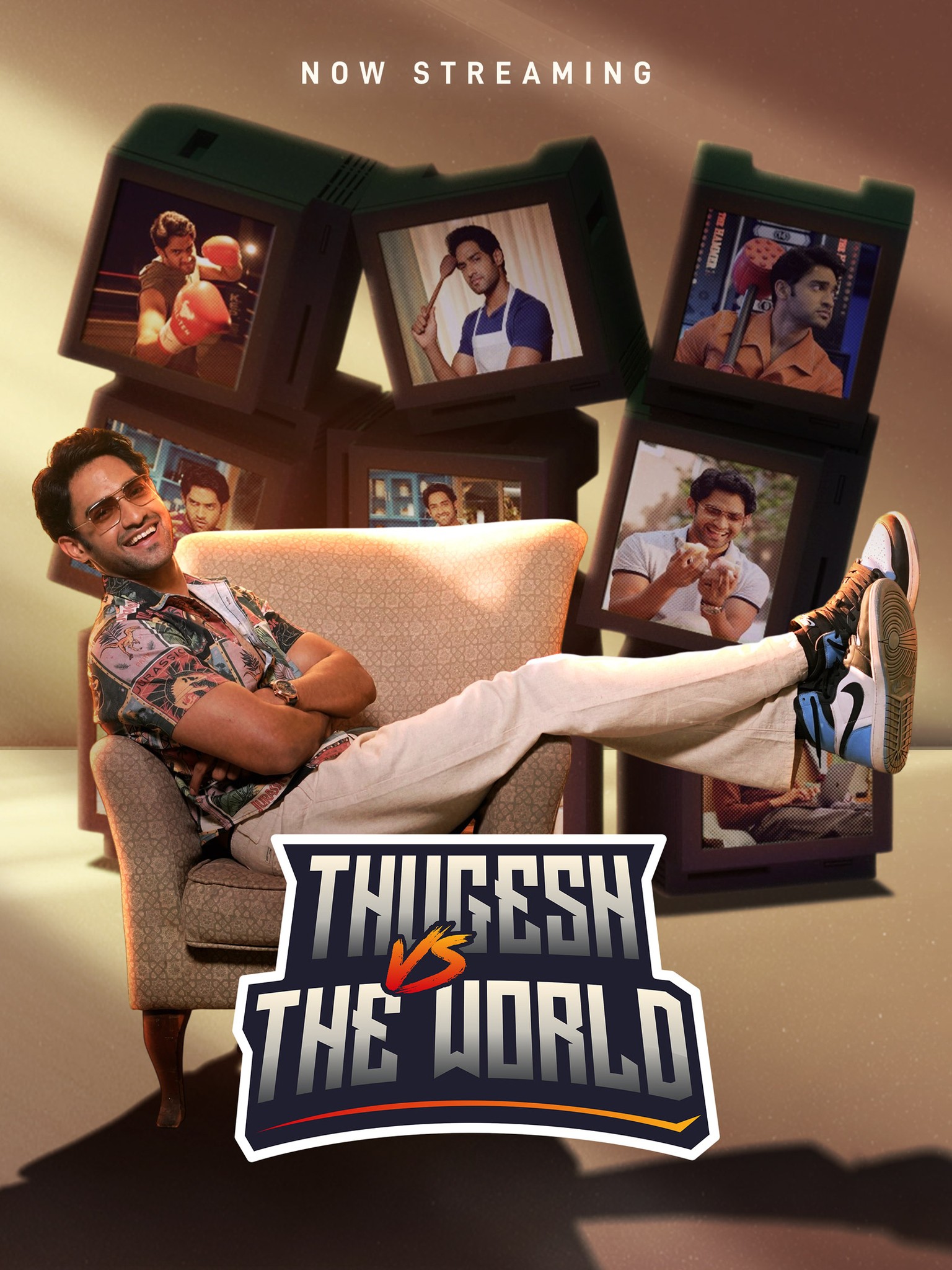 The poster featured Thugesh in the foreground, with TV screens in the background showing him engaged in different activities.