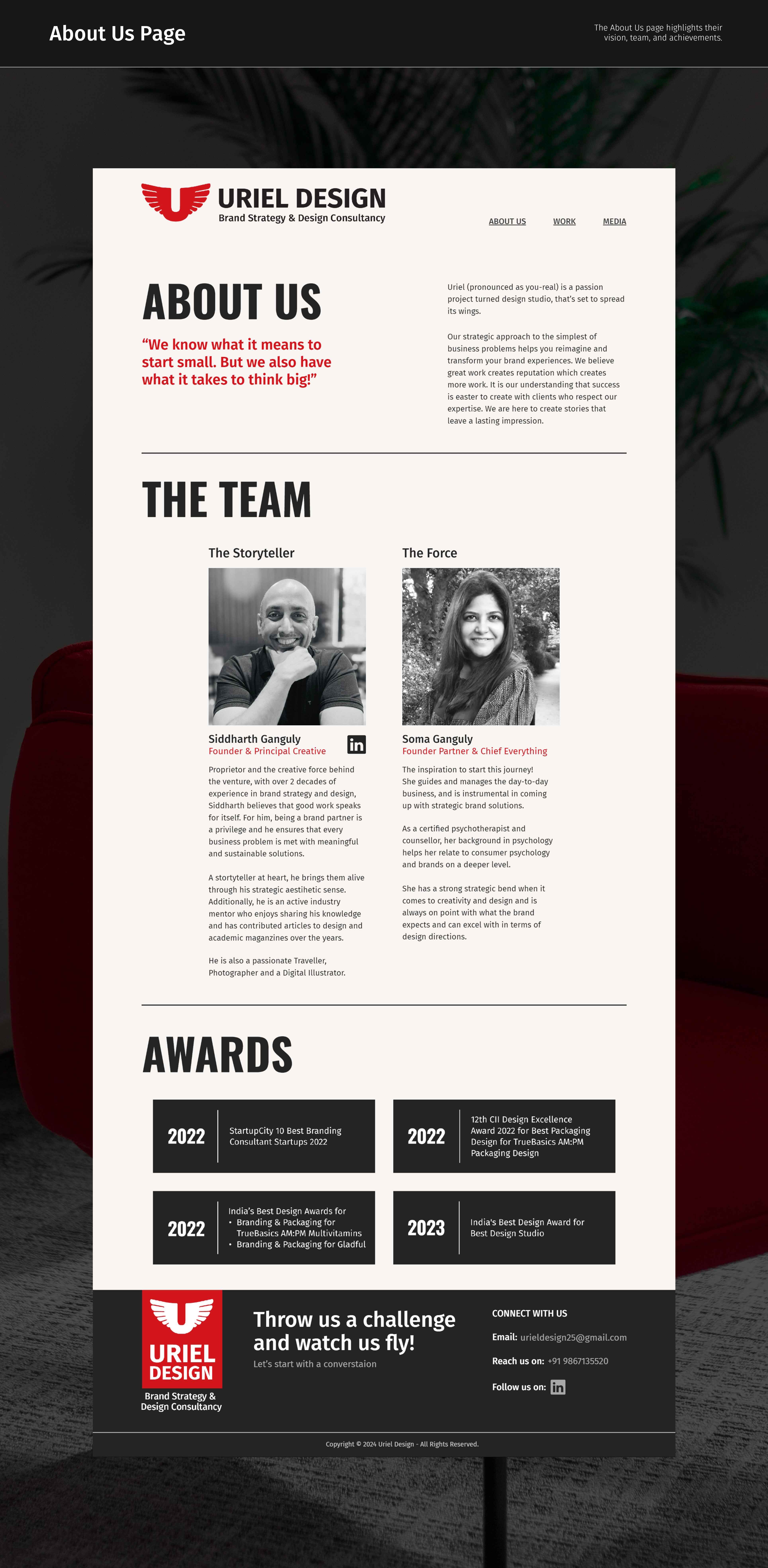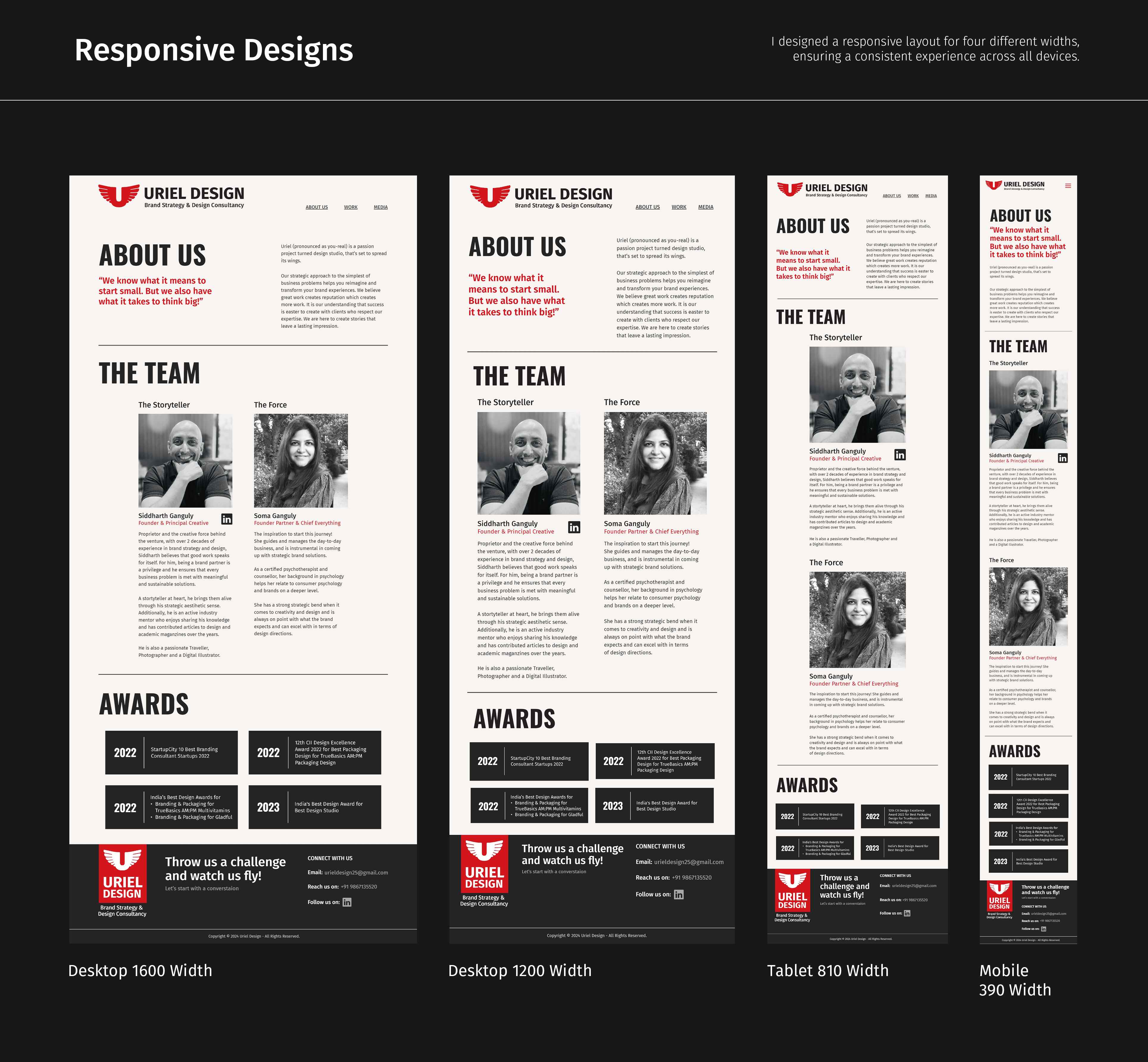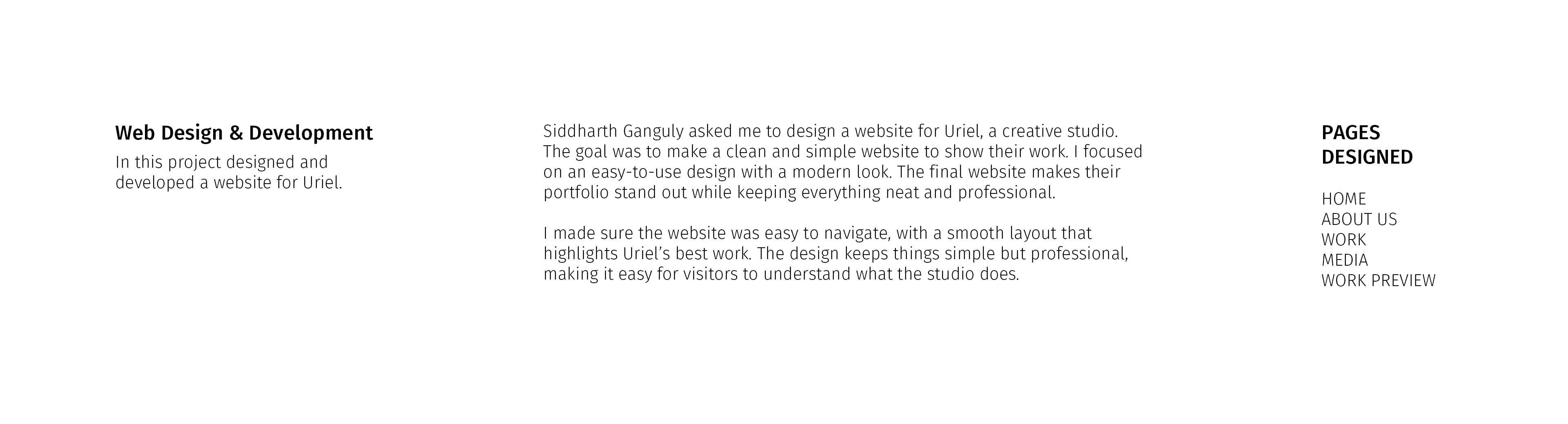 Siddharth Ganguly asked me to design and build a simple, modern website for Uriel to show their work. I made it responsive for four screen sizes so it works well on all devices. Fira Sans was used for body text, and Oswald for headings to keep it clean and professional. The website has a homepage, an About Us page, and portfolio pages, all designed to match Uriel’s brand and make it easy to use.